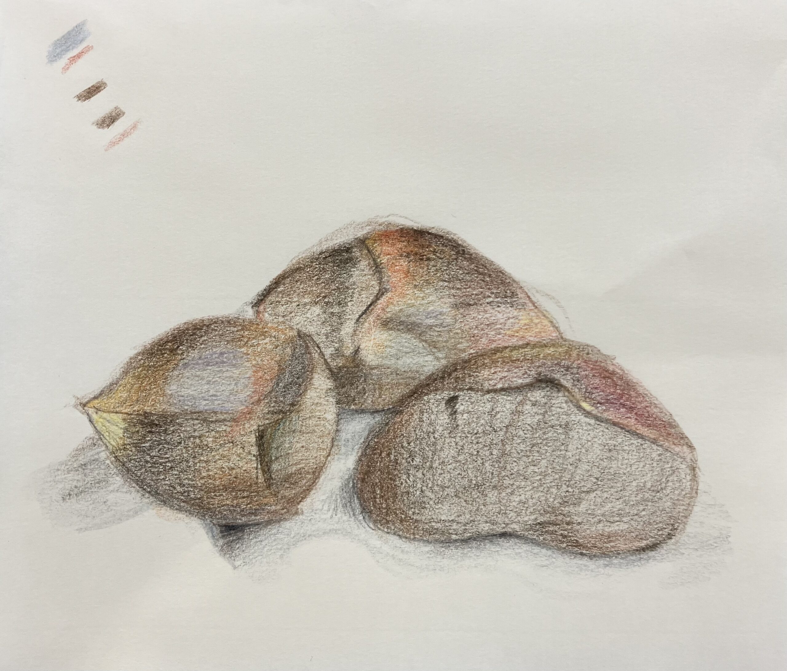 他の子は複数描いたが、彼女は一つに絞って描いた。しっかり強く塗りつぶして描いていた。栗のカラの硬さを感じていたのかもしれない。